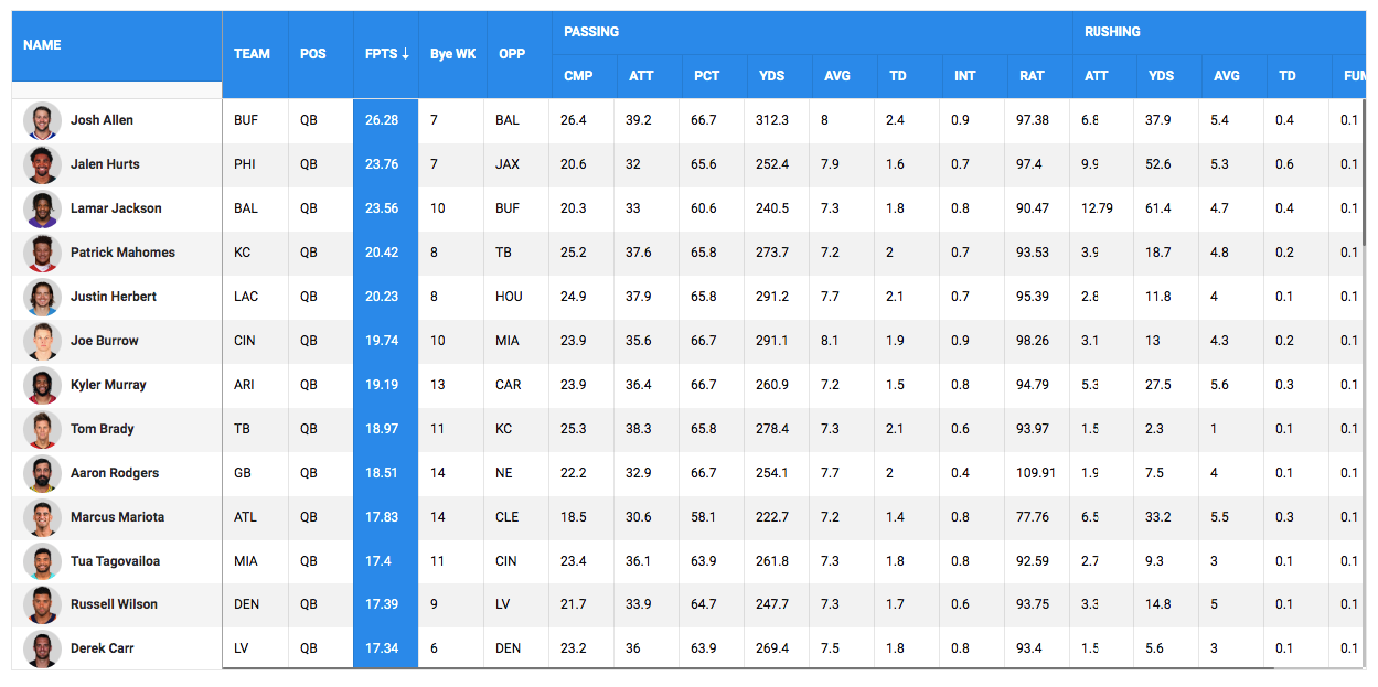 The Buffalo Bills quarterback is in strong contention for league MVP this year. Allen threw for 213 yards and a touchdown with an interception and scored 26.28 fantasy points for his respective team managers. Next up for Allen and the Buffalo Bills are the Pittsburgh Steelers.
