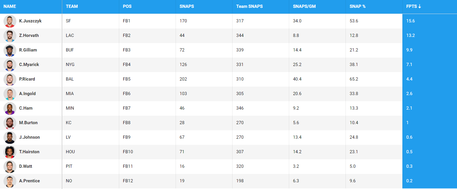 The total number of plays in which a running back took part in a particular week is shown by snap counts. In all other respects, a greater snap count is preferred since it shows that the player has more chances to rack up numbers.