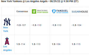 | 8 | Yankees -1.5, 1.5 Angels | -182, 153 |
