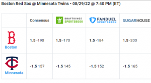 | 8.5 | Red Sox 1.5, -1.5 Twins | 105, -124 |