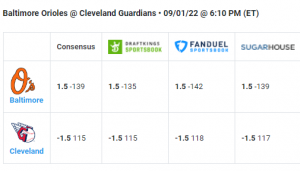 For the Orioles, Dean Kremer has 62 strikeouts and 18 walks in 83.1 IPs at a 3,24 ERA. Meanwhile, the Guardians have Shane Bieber who has 153 strikeouts and 32 walks in 152.0 IPs at a 3.02 ERA. Listed below are the MLB Betting Odds for the game: