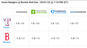 | 9 | Rangers 1.5, -1.5 Red Sox | 151, -177 |